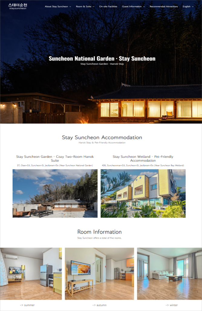 Stay Suncheon 프로젝트를 통해 숙소 운영에 최적화된 홈페이지 구조를 구축했습니다.